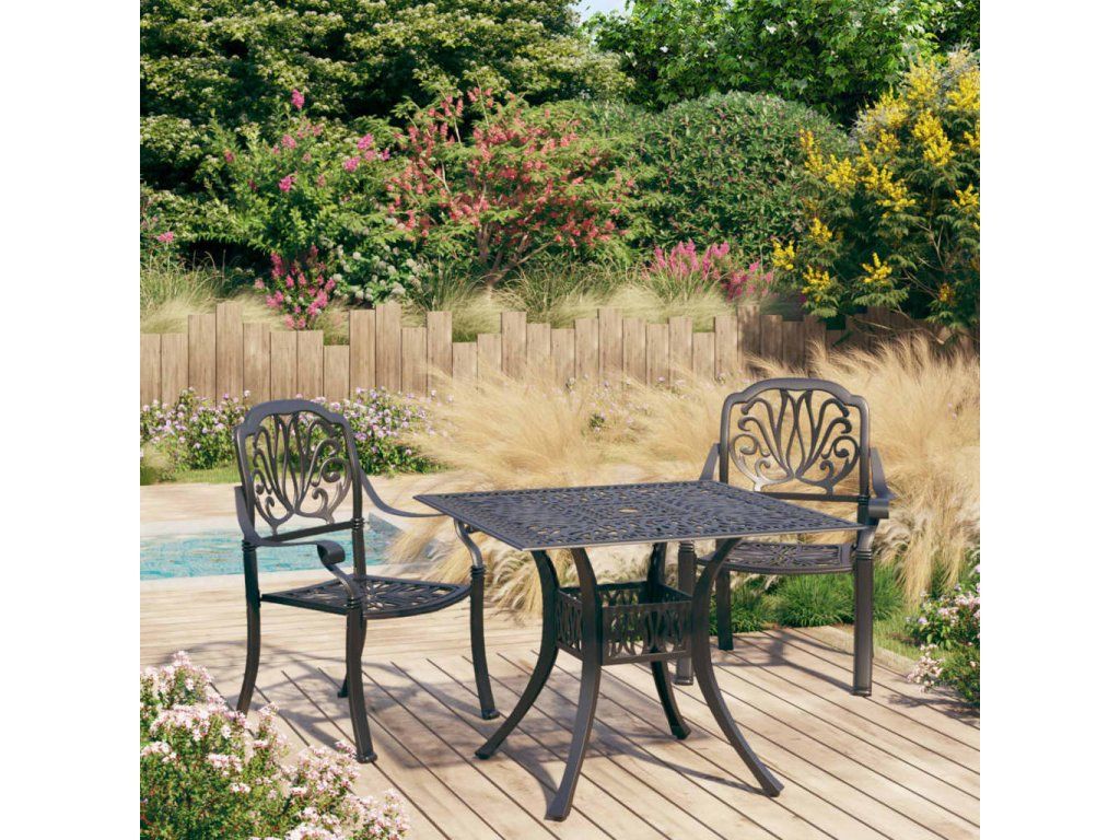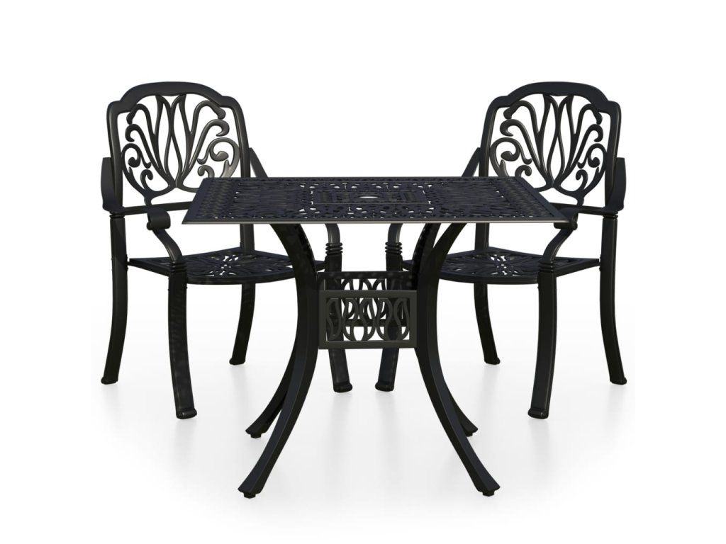 Zahradní stůl a židle z litého hliníku jsou robustní a hodně toho vydrží. Jelikož jsou vyrobené z materiálu, který nerezaví a nepodléhá klimatickým vlivům, jedná se o ideální nábytek pro venkovní použití. Vzhledem ke svému překrásnému designu zapůsobí bistro set ve vašem venkovním bydlení jako elegantní doplněk. Konferenční stolek má navíc uprostřed otvor, kam můžete zasunout slunečník, abyste se ochránili před sluníčkem či deštěm.